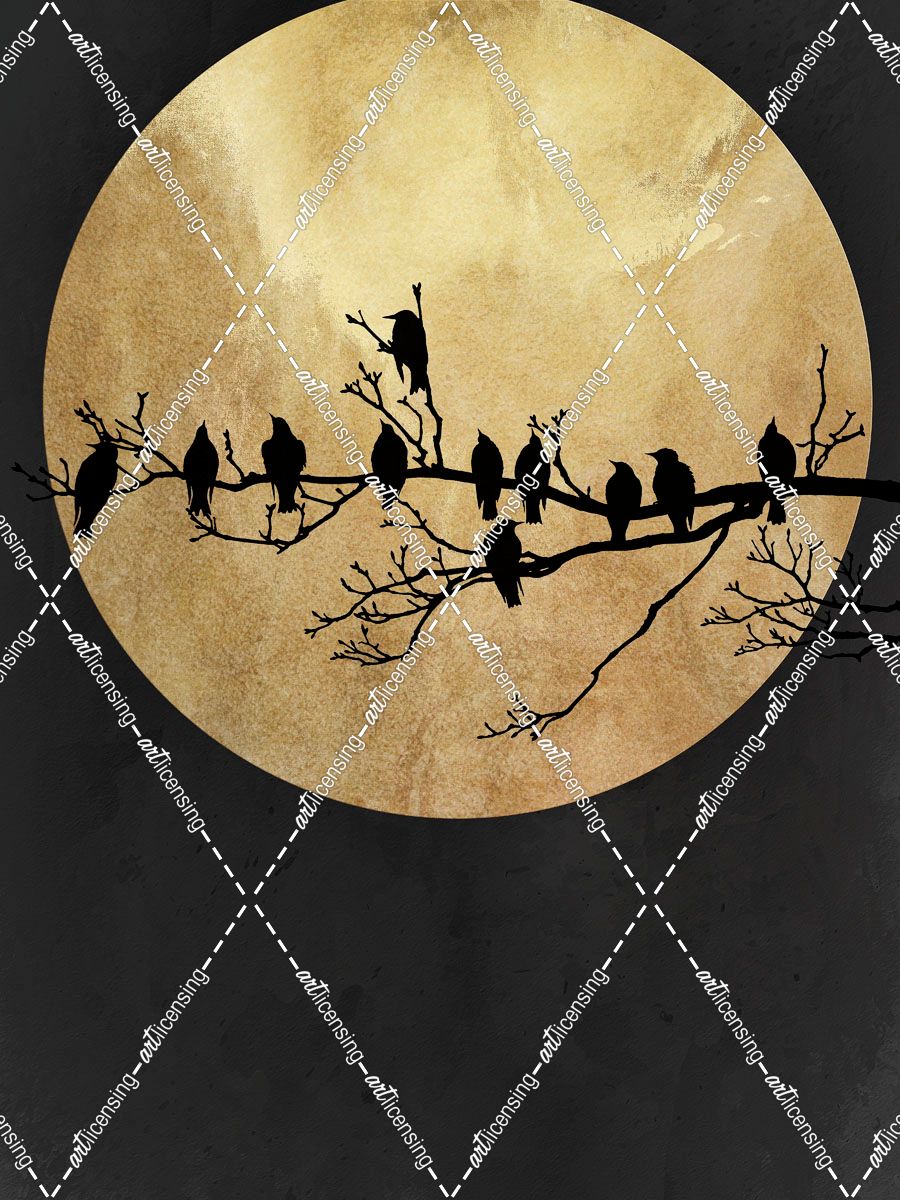 Sparrows On A Branch At Full Moon