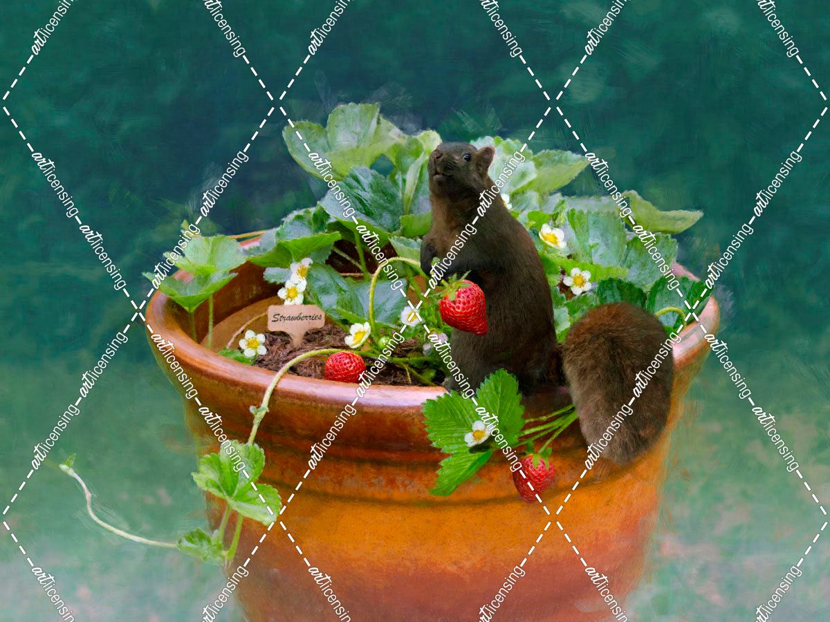 Squirrel in a Pot of Strawberries on a Foggy Morning