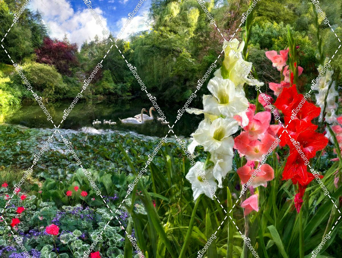 Summer Landscape With Swans and Gladiolus