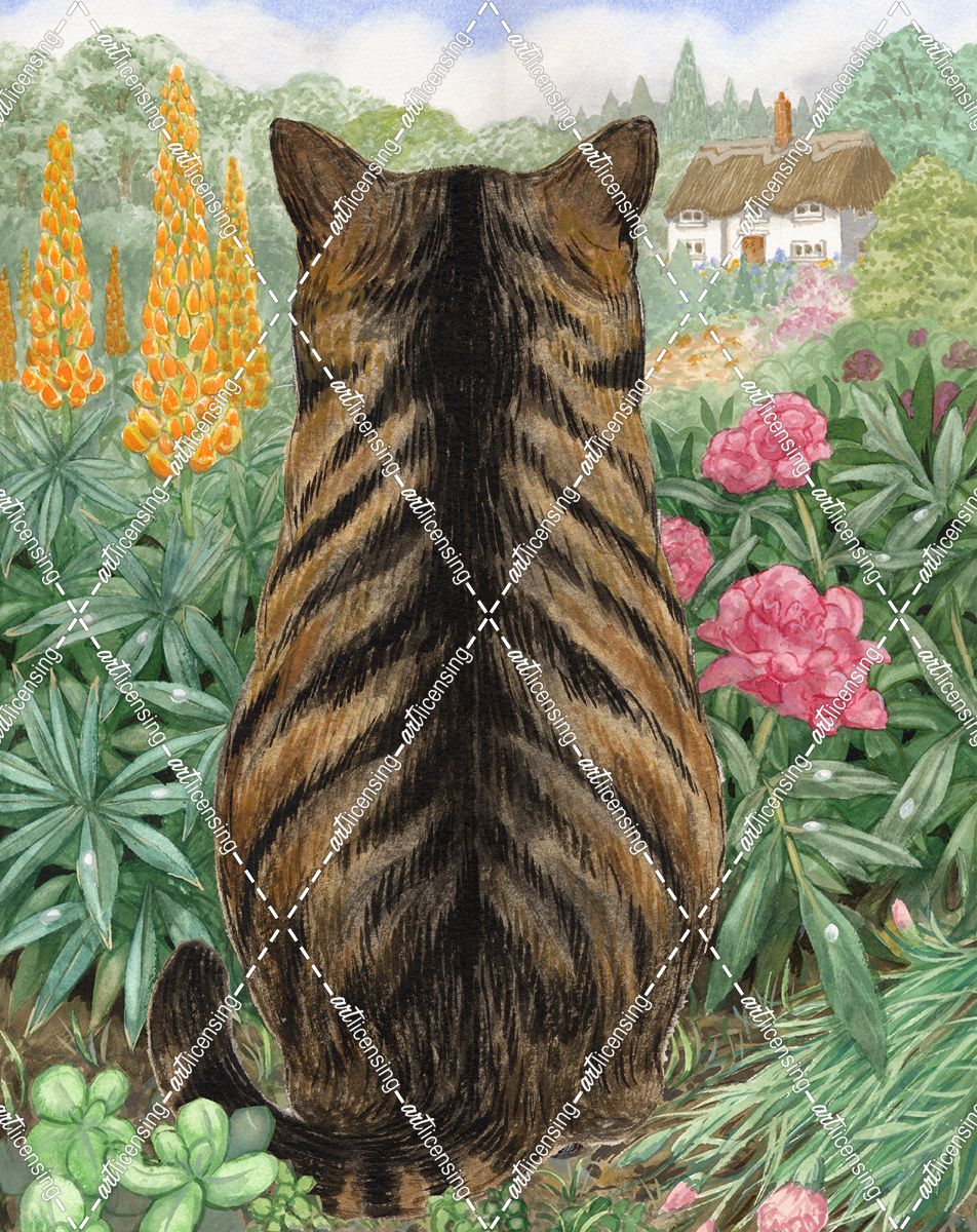 Tabby Cat In Garden With Lupins Back