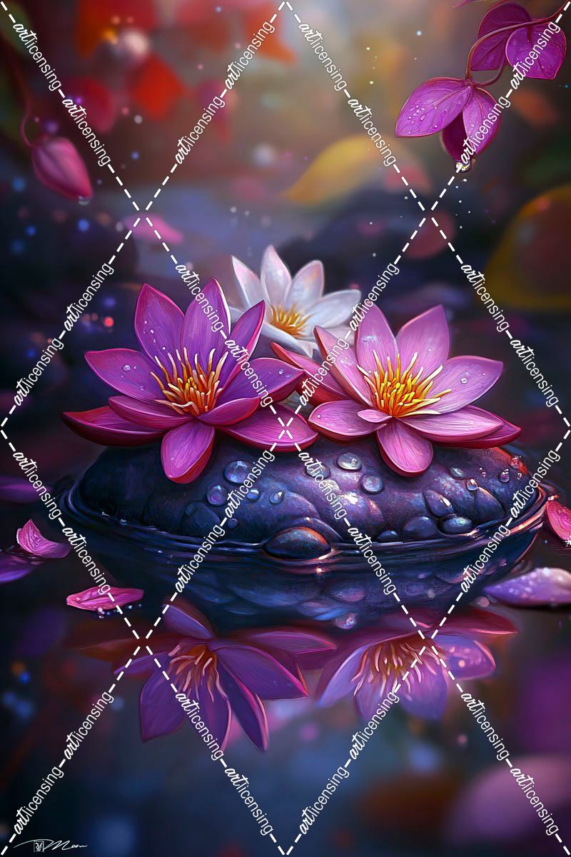 Three Lotus Flowers On A Rock In The River
