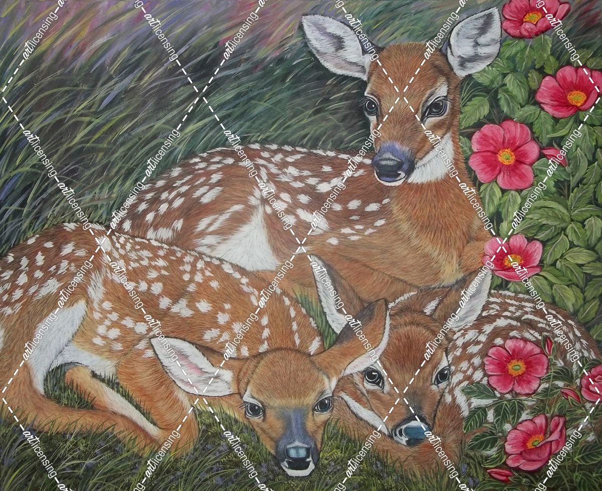 Three White-Tailed Deer Fawns With A Wild Rose Bush
