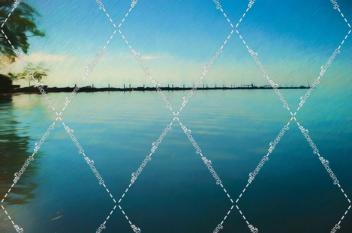 Trees And Pier On Sea At Dusk