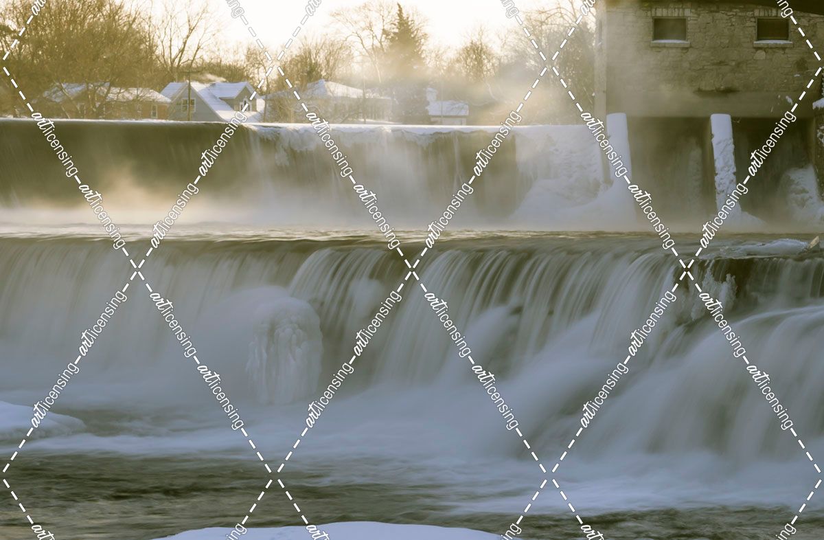 Waterfalls And Dam In Winter