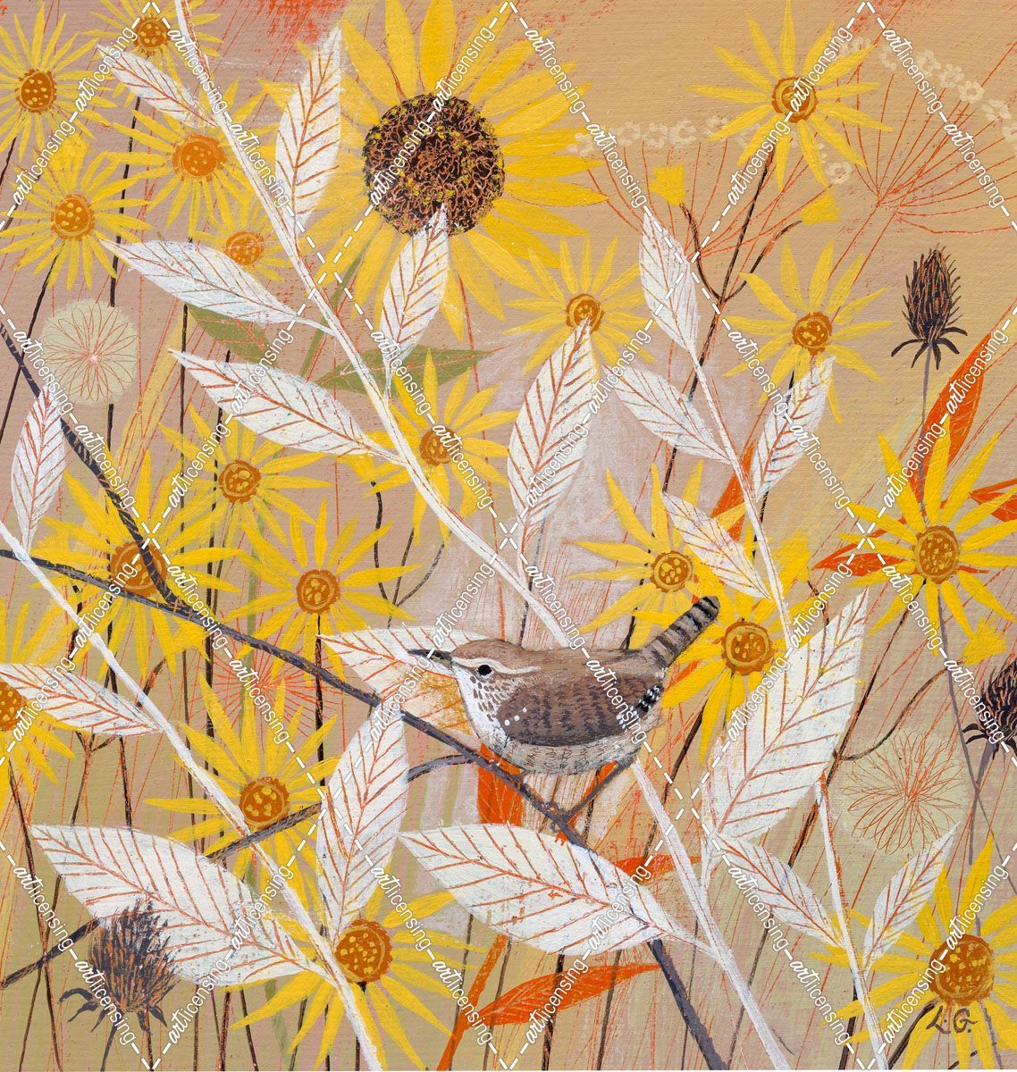 Wren and Yellow Flowers